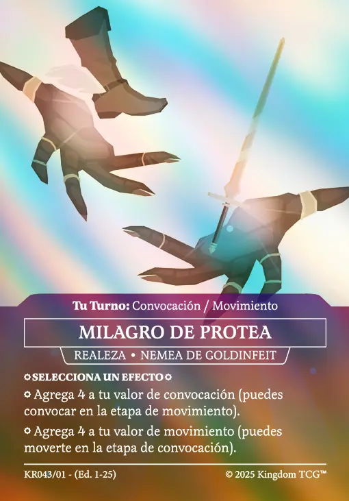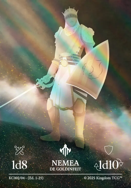 - Espacio 5: Estrategia Primigenia. Las "estrategias primigenias" son los nuevos tipos de carta de Kingdom TCG™ y son exclusivas de los kits de coronado (al menos hasta el momento). Vienen en 3 rarezas distintas: Común, Holo, y Shadow Gold. El slot de estrategia primigenia puede contener cualquiera de las 3 rarezas posibles.