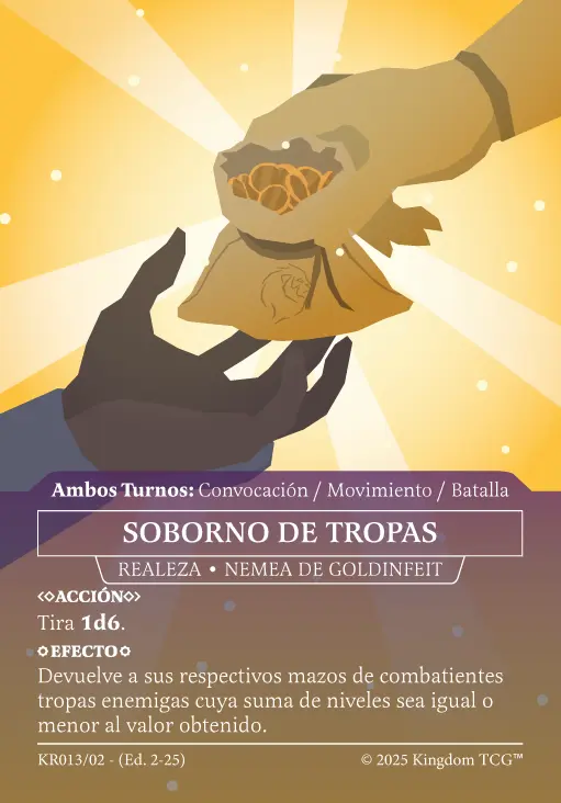 - Espacio 6: Carta de Coronado. Cada coronado cuenta con 8 modelos distintos, de los cuales 4 tienen acabado común y 4 tienen acabado foil. Pueden encontrarse artes alternativos, full art, see through, shadow gold y mucho más. Las cartas de coronado incluidas en los mazos de batalla por defecto NO se incluyen en los kits de coronado.
